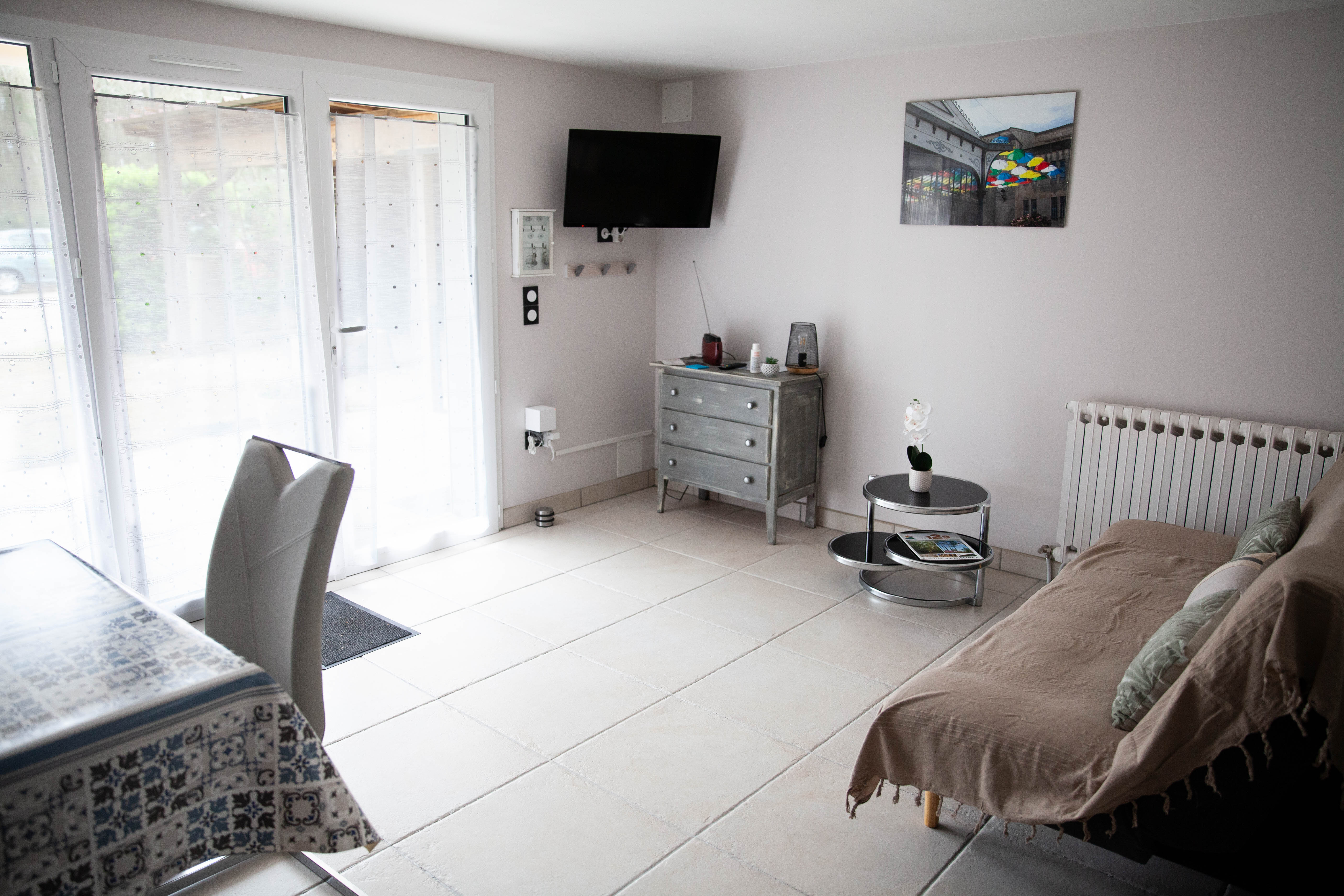 La pièce principale de 25 m² comprend une cuisine équipée et un salon avec canapé convertible, ouvrant par une grande baie vitrée sur une terrasse privée côté cour.