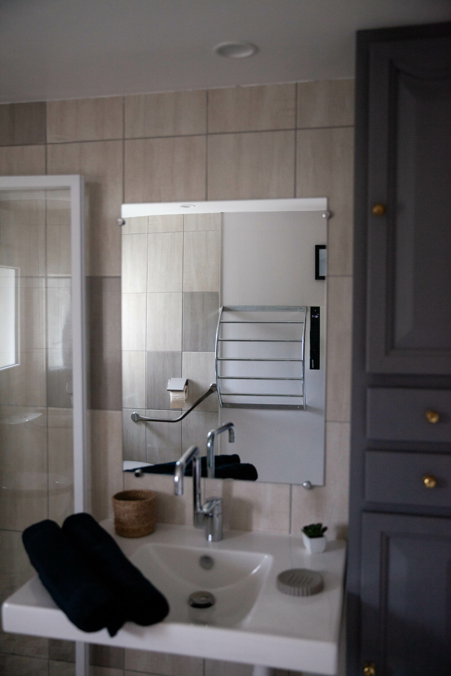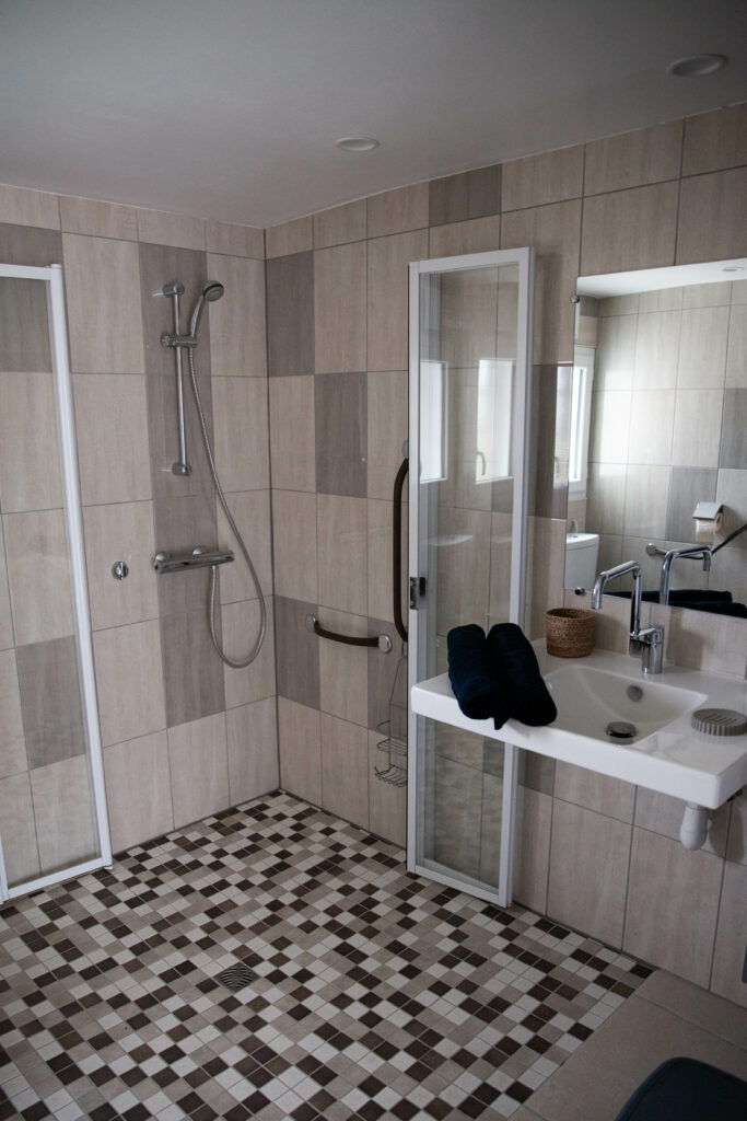 La salle d’eau dispose d’un lavabo, d’une douche à l’italienne avec portes amovibles et d’un WC.