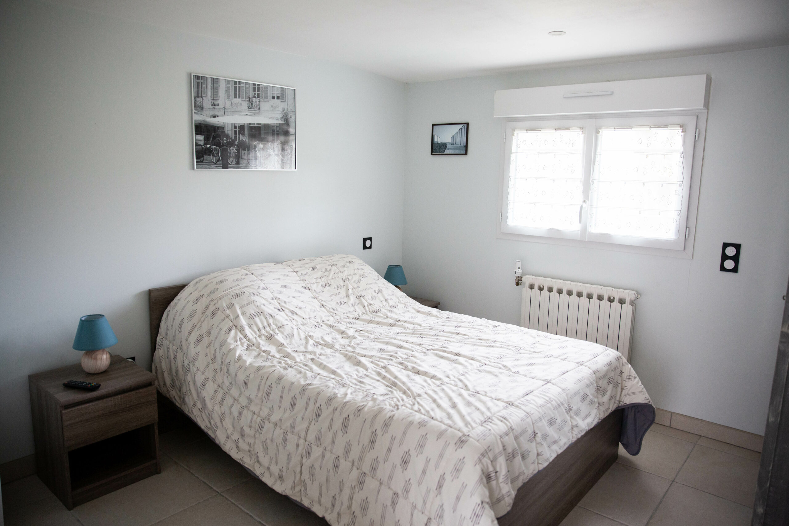 La chambre est dotée d’un lit 140 × 190 cm, de deux chevets et d’une armoire, avec une fenêtre donnant sur le jardin.